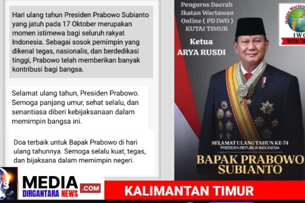 Kutai Timur – Presiden Republik Indonesia, Jenderal TNI (Purn) H. Prabowo Subianto, merayakan ulang tahunnya yang ke-74 pada Jumat (17/10/2025). Berbagai ucapan selamat mengalir dari berbagai kalangan, termasuk dari organisasi media online dan komunitas. Pengurus Daerah Ikatan Wartawan Online (PD IWO) Kabupaten Kutai Timur menjadi salah satu yang mengucapkan selamat ulang tahun kepada Presiden Prabowo…