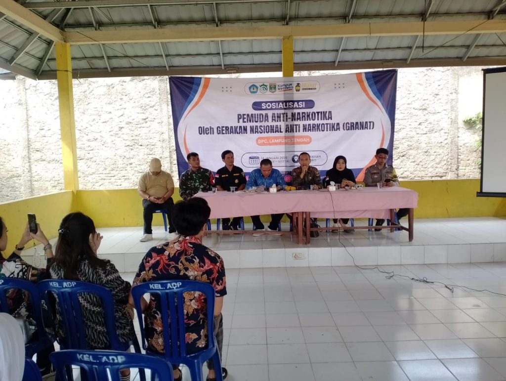 Lampung Tengah| Mahasiswa dan Mahasiswi Peserta KKN Universitas Lampung Tahap 1 2025, DPC. GRANAT Lampung Tengah dan Kelurahan Adipuro mengadakan acara Penyuluhan P4GN (Pencegahan dan Pemberantasan Penyalahgunaan dan Peredaran Gelap Narkotika, Psikotropika dan Prekursor lainnya), bertempat di Aula Kelurahan Adipuro Kecamatan Trimurjo Lampung Tengah. Selasa (14/1/2025).