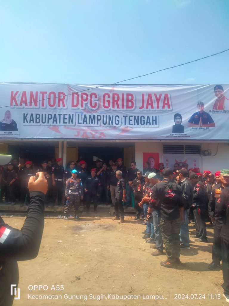 Lampung Tengah – DGNews | Massa Ormas GRIB JAYA yang datang dari 15 Kabupaten dan Kota se Provinsi Lampung hari ini Rabu 24 Juli 2024 tampak memadatai Kantor GRIB JAYA DPC Gunung Sugih Lampung Tengah. Tampak terlihat Ribuan massa berkumpul didepan Kantor Sekretariat DPC GRIB Jaya Lampung Tengah yang di koordinasi oleh GRIB JAYA DPD Lampung, menggelar aksi damai menolak transportasi armada batu bara.