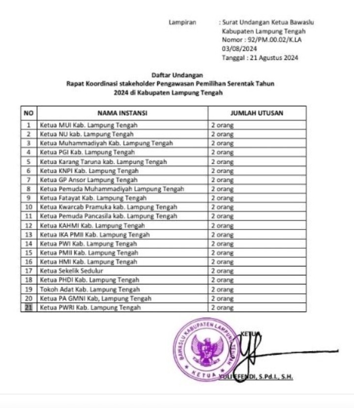 “Lampung Tengah adalah termasuk daerah rawan dalam pelaksanaan pemilu pilkada, hal ini tentunya perlu diantisipasi bersama mengingat pilkada tahun lalu 2020 banyak laporan yang diterima oleh Bawaslu,” Kata Yuli Efendi Ketua Komisioner Bawaslu Lampung Tengah.