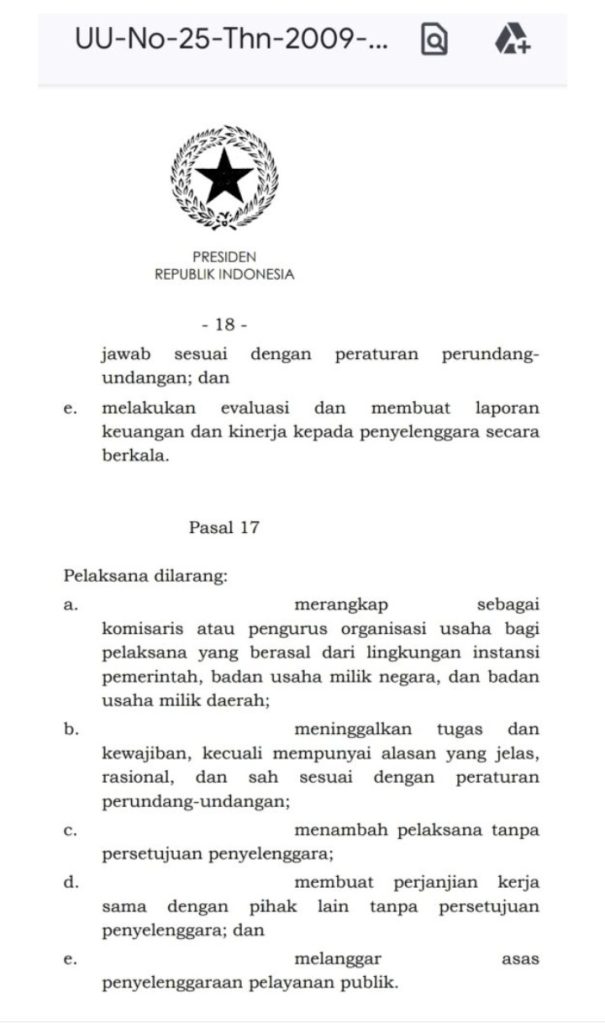 Pasalnya, sudah jelas bahwa amanat UU No. 25 Tahun 2009 Pasal 17 melarang PNS/ASN merangkap jabatan. “Apabila ada peraturan lain yang menjadi acuan, harus tetap berlandaskan UU yang berlaku di Republik Indonesia ini,” kata Uncu Wenda.