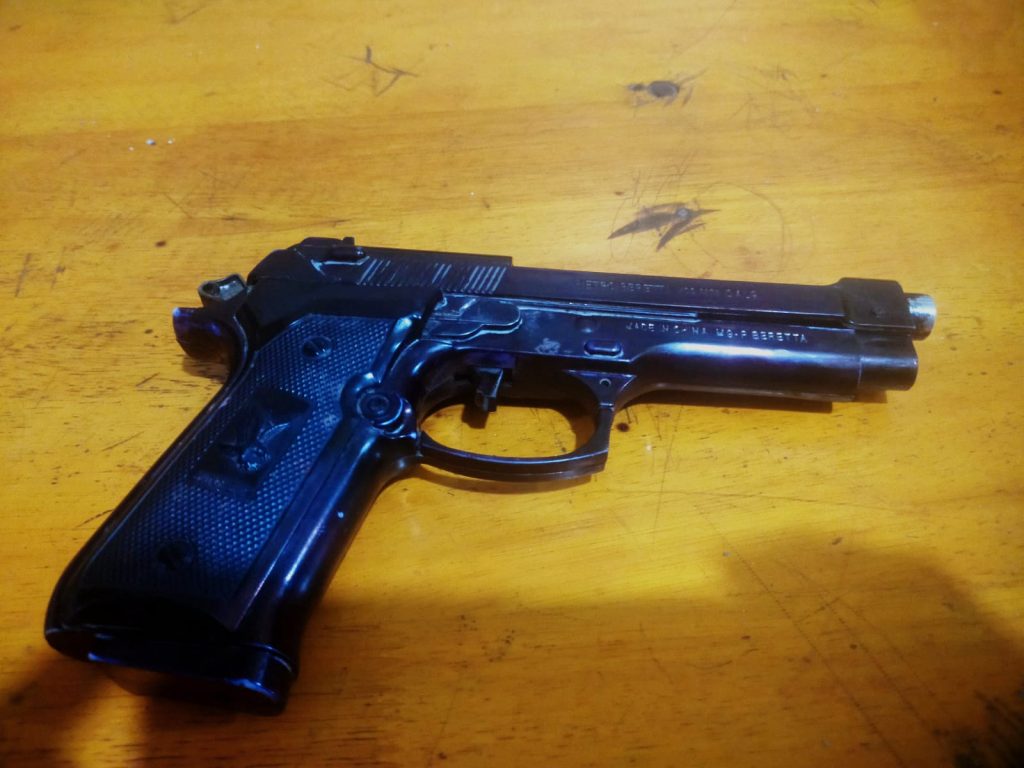 Pistol mainan yang dibawa SP (53) dan DS (32) digunakan untuk menodong Wahyu Hatarto (31) di jalan Kampung Bumiraharjo, Kecamatan Bumiratu Nuban, Lampung Tengah, pada Sabtu (2/3/24) lalu.
