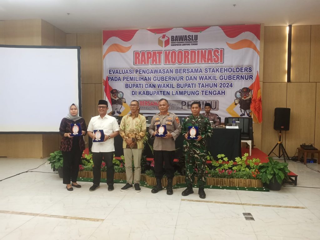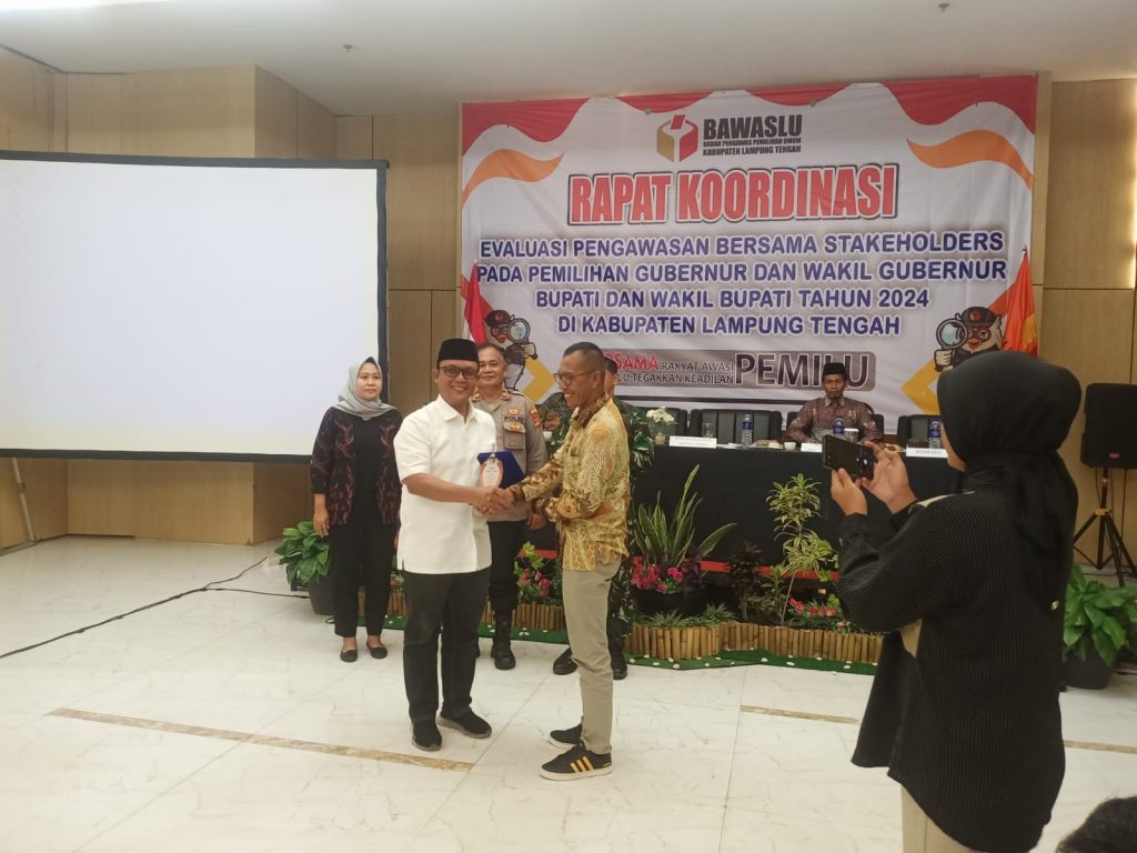 Diakhir acara ketua Bawaslu menyampaikan prasasti tanda penghargaan atas terselenggaranya pemilihan yang telah terlaksana berjalan sukses aman dan damai kepada Bupati/Wakil Bupati Lampung Tengah, Kapolres dan Dandim. (Red)
