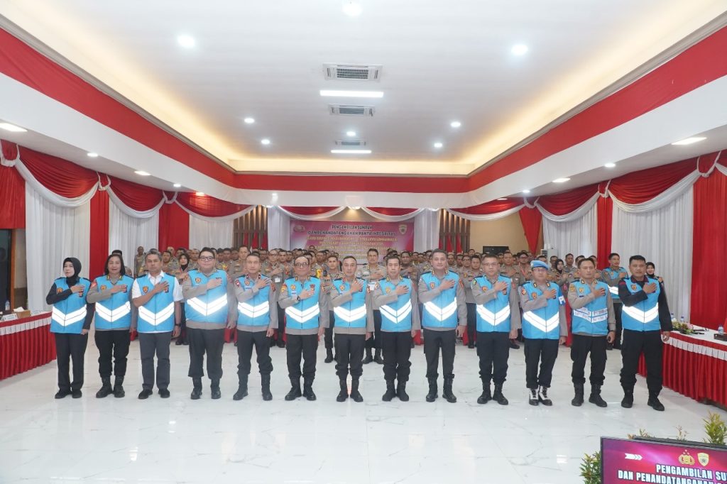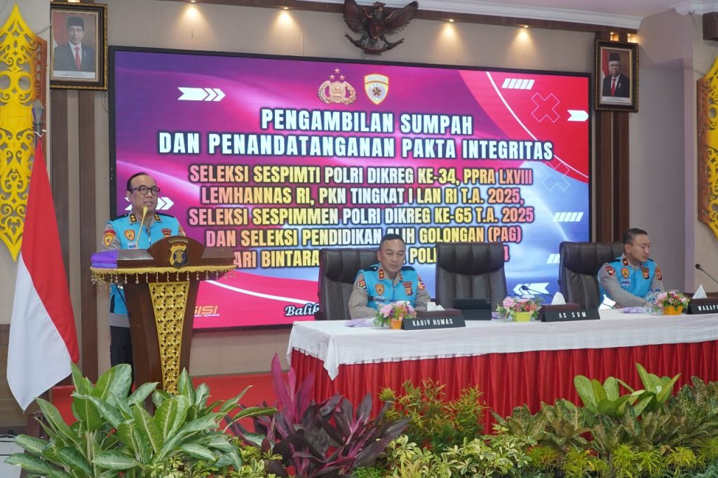 BALIKPAPAN— AS SDM Kapolri Irjen Pol Prof. Dr. Dedi Prasetyo, M.Hum, M.Si, M.M pimpin langsung acara Pengambilan Sumpah dan Penandatanganan Pakta Integritas untuk Seleksi Sespimti Polri Dikreg Ke-34 PPRA LXVIII Lemhanas Polri, PKN Tingkat I LAN RI T.A. 2025, Seleksi Sespimen Polri Dikreg Ke-65 T.A. 2025, serta Seleksi Pendidikan Alih Golongan (PAG) dari Bintara ke Perwira Polri Tahun Anggaran 2024. Selasa (13/08/24).