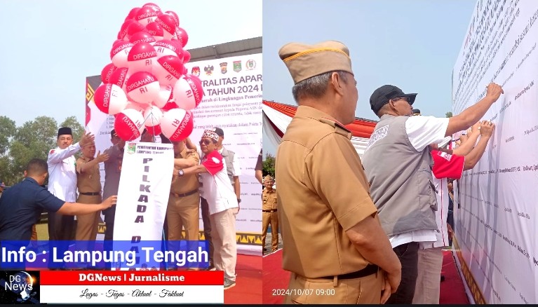 Lampung Tengah – DGNews | Dalam mensukseskan Pilkada Tahun 2024, Bawaslu Lampung Tengah yang mempunyai tugas pokok dan fungsi sesuai dengan Pasal 101 UU Nomor 7 tahun 2017 sebagai pengawas pemilu dan melakukan pencegahan serta penindakan pelanggaran pemilu, telah menghadiri deklarasi netralisasi ASN pada pilkada tahun 2024 yang di selenggarakan oleh Pemerintah Daerah Kabupaten Lampung Tengah di lapangan merdeka Gunung Sugih.