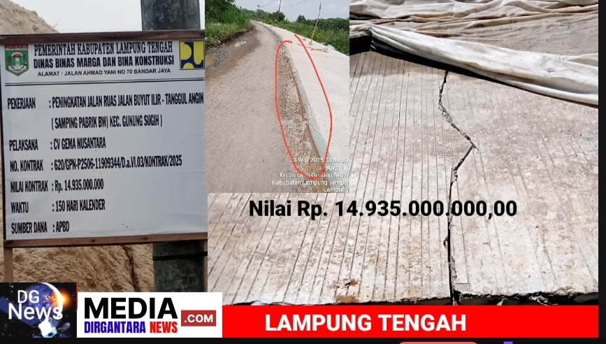 Lampung Tengah – Pembangunan peningkatan jalan ruas jalan (rigid beton) anggaran APBD Pemerintah daerah kabupaten Lampung Tengah tahun 2025 yang bernilai kontrak Rp. 14.935.000.000,00 di Buyut ilir Tanggul Angin (samping pabrik BW) Kecamatan Gunung Sugih Lampung Tengah nama penyedia CV. Gema Nusantara diduga mengerjakannya asal asalan tidak sesuai bestek.