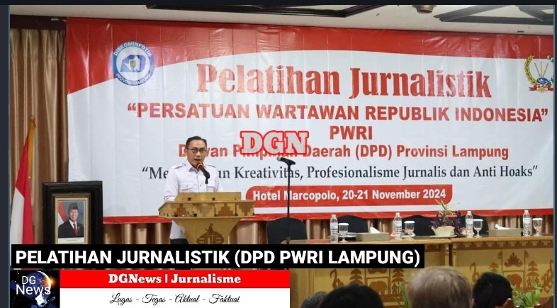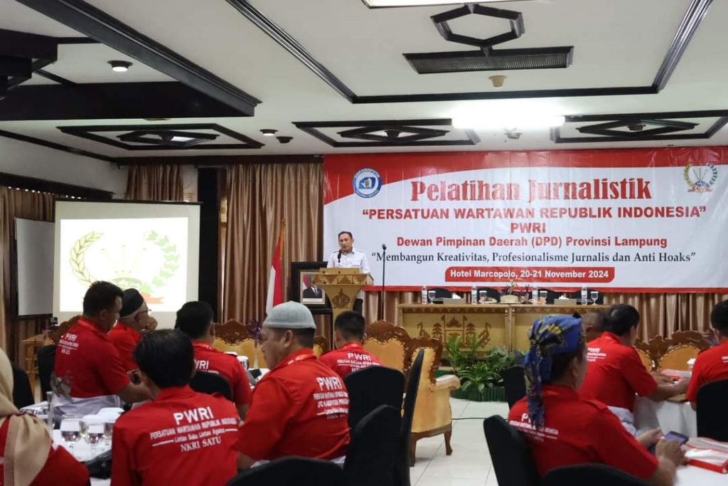 BANDAR LAMPUNG — Kepala Dinas Kominfotik Provinsi Lampung yang diwakili oleh Sekretaris Dinas Kominfotik Provinsi Lampung, Elip Heldan, membuka Pelatihan Jurnalistik yang diselenggarakan oleh Persatuan Wartawan Republik Indonesia (PWRI) Provinsi Lampung, di Hotel Marcopolo, Rabu (20/11/2024).