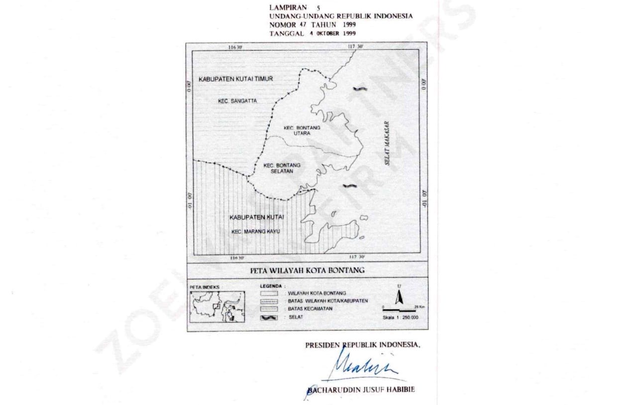 Pasal 6 PP No. 20 tahun 1989 berbunyi, “wilayah Kota Administrasi terdiri dari dua Kecamatan yakni Kec. Bontang Utara dan Bontang Selatan.