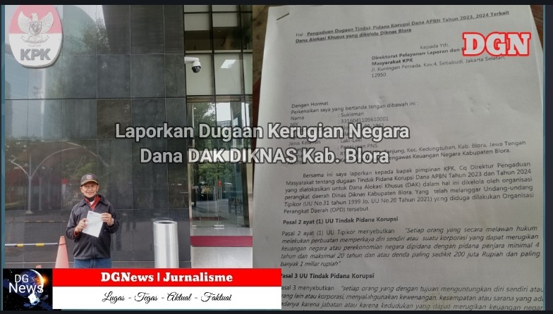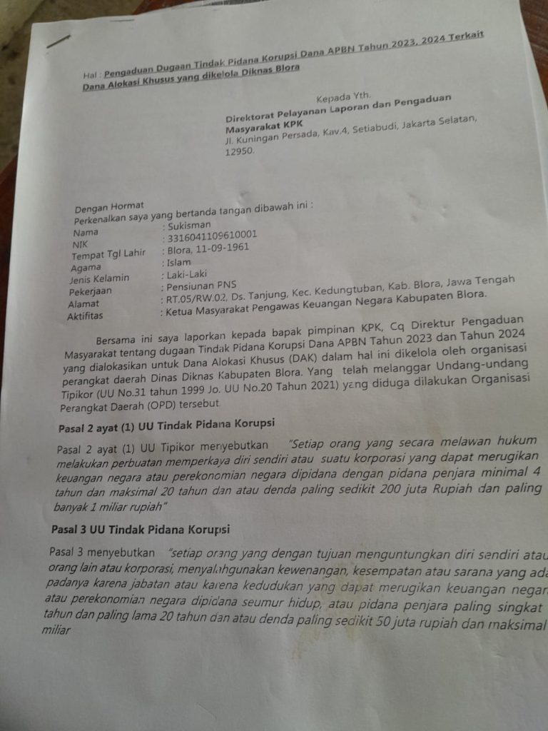 GAWAT KETUA MPKN LAPOR KE KPK: DIDUGA ADA POTENSI KERUGIAN KEUANGAN NEGARA 25.2 MILYAR DALAM PENGELOLAAN DAK DIKNAS KAB. BLORA