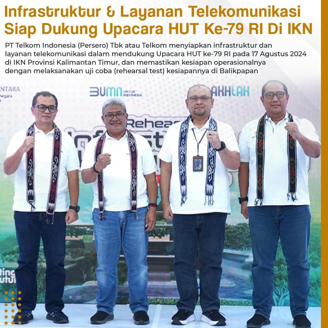 DGNews – PT Telkom Indonesia (Persero) Tbk atau Telkom menyiapkan infrastruktur dan layanan telekomunikasi dalam mendukung Upacara HUT ke-79 RI pada 17 Agustus 2024 di Ibu Kota Nusantara (IKN) Provinsi Kalimantan Timur, dan memastikan kesiapan operasionalnya dengan melaksanakan uji coba (rehearsal test) kesiapannya di Balikpapan.