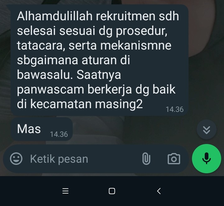 Pertanyaan dan jawaban whatsapp awak media DGNews kepada Ketua Bawaslu Lamteng apakah berita yang sedang beredar tentang rekruitmen panwascam yang dinilai tidak fair soal panwascam bandarmantaram yang lulus berasal dari daerah lain tidak melanggar peraturan?