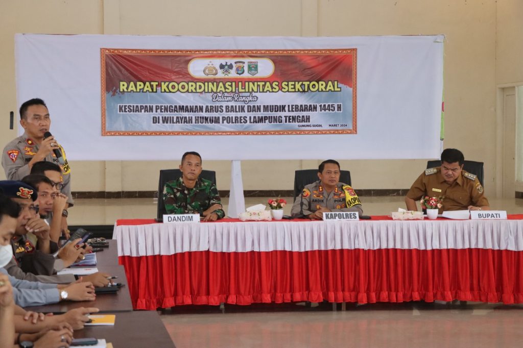 Lampung Tengah| Jajaran Polres Lampung Tengah Polda Lampung menggelar rapat kordinasi (Rakor) lintas sektoral dalam rangka kesiapan pengamanan Idul Fitri 1445 H / 2024 M untuk memastikan pelaksanaan arus mudik dan balik berjalan aman dan lancar. Selasa (26/3/24) pagi.