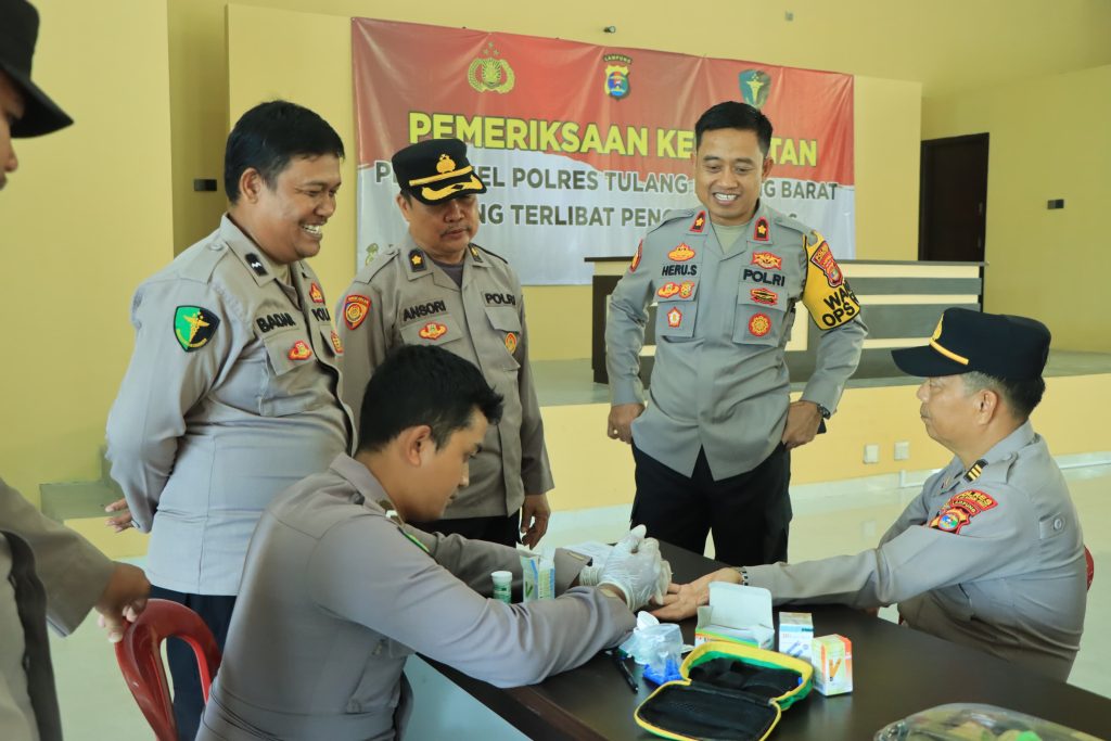 TUBABA| Menjelang Pemilihan Umum (Pemilu) 2024, Polres Tulang Bawang Barat, Polda Lampung melaksanakan pemeriksaan kesehatan bagi personel yang akan terlibat dalam pengamanan Tempat Pemungutan Suara (TPS) yang berlangsung di Aula Polres Tulang Bawang Barat, Selasa (6/1/2024).