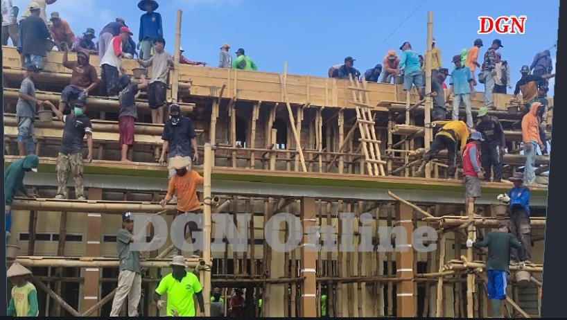 Lampung Tengah | Proses pembangunan masjid Jami Al Falah Buyut Udik yang atapnya runtuh terkena bencana dan di duga pengerjaanya dari anggaran APBD 2017 material bangunan tidak sesuai bestek kini sudah 60 persen tahap rehab swadaya warga masyarakat setempat. Dalam proses pembangunan warga masyarakat Buyut Udik melakukan gotong royong untuk cor dak beton atap masjid, Rabu (31/07/2024).