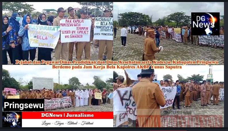 Lampung – Sejumlah pejabat dan pegawai ASN dari tiga instansi berbeda menggelar aksi damai di Pringsewu, Lampung, Senin, 17 Maret 2025. Aksi tersebut menuntut agar Kapolres Pringsewu, AKBP M Yunus Saputra, tidak dicopot dari jabatannya. Para demonstran menyuarakan orasi dengan tujuan mempertahankan posisi sang Kapolres. Mereka mengenakan pakaian seragam instansi masing-masing, yakni Dinas Pendidikan Pringsewu, Dinas Kesehatan Pringsewu, dan para Kepala Pekon (Kepala Desa) se-Kabupaten Pringsewu.