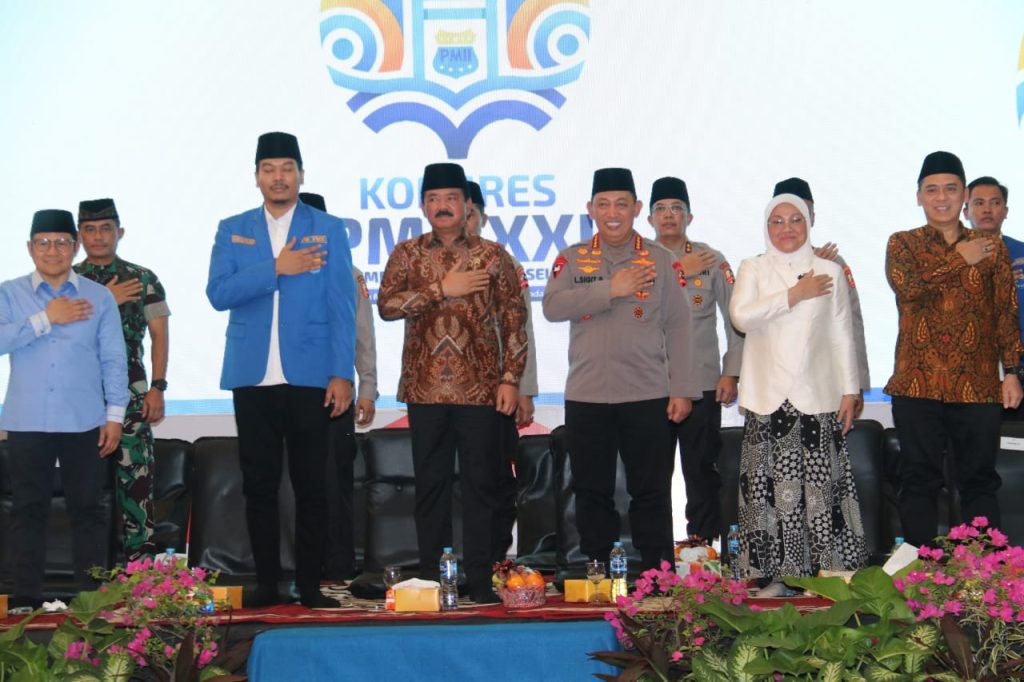 PALEMBANG — Kapolri Jenderal Polisi Drs. Listyo Sigit Prabowo mendampingi Menteri Politik, Hukum, dan Keamanan (Menkopolhukam) Hadi Tjahjanto menghadiri Kongres XXI Pergerakan Mahasiswa Islam Indonesia (PMII) di Palembang, Sumatra Barat (Sumbar). Kehadiran keduanya disambut langsung oleh Ketua PB PMII Muhammad Abdullah Syukri.