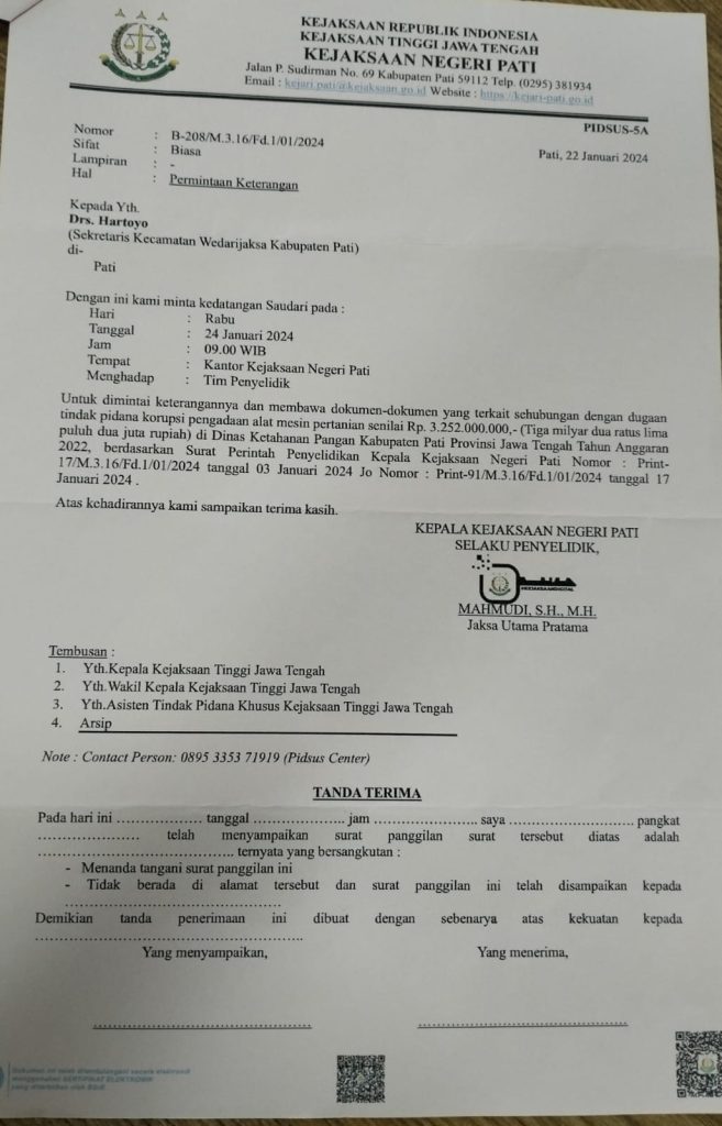 Surat perintah penyidikan dari kejaksaan negeri Pati,pada seksi pidana khusus (siepidsus) telah sudah dimulai. Sebelumnya Kejari Pati memang menerbitkan surat perintah penyelidikan (sprinlidik) yang bernomor : Print-91/M.3.16/Fd.1/01/2024. Surat tersebut terbit pada tanggal 17 Januari 2024.