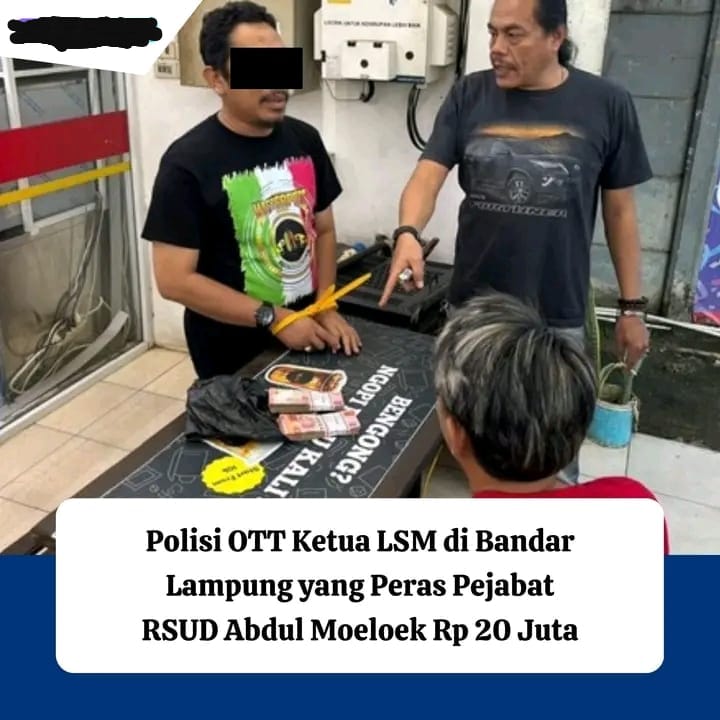 Bandar Lampung – Polda Lampung berhasil melakukan Operasi Tangkap Tangan (OTT) terhadap seorang Ketua Lembaga Swadaya Masyarakat (LSM) dan seorang anggotanya setelah keduanya diduga melakukan pemerasan terhadap pihak Rumah Sakit Umum Abdul Moeloek, Lampung. Penangkapan ini berhasil mengamankan barang bukti berupa uang tunai sebesar Rp 20 juta.
