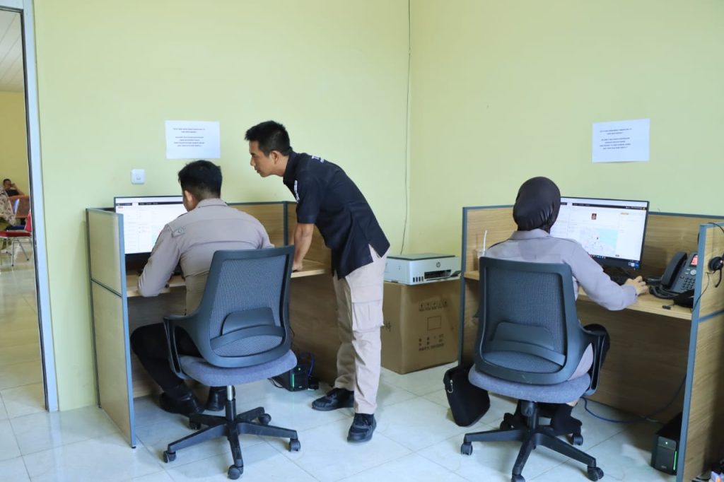 Pemasangan bandwith jaringan internet indibiz perangkat baru 110 Polres Tulang Bawang Barat diawasi langsung oleh Kabid TIK Polda Lampung Kombes Pol M Arief Rifa’i, S.I.K., di Polres Tulang Bawang Barat, pada selasa 30 Januari 2024.