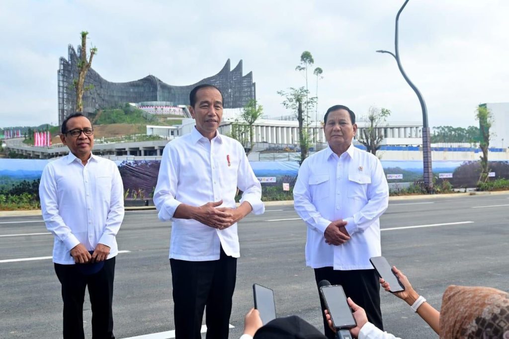 PPU – DGNews | Mengawali kegiatan di Ibu Kota Nusantara (IKN), Kabupaten Penajam Paser Utara, Provinsi Kalimantan Timur, pada Senin pagi, 12 Agustus 2024, Presiden Joko Widodo didampingi Menteri Pertahanan (Menhan) yang juga Presiden terpilih 2024-2029 Prabowo Subianto meninjau langsung progres pembangunan IKN. Keduanya berjalan bersama-sama melihat sejumlah infrastruktur yang sedang dibangun dan berhenti sejenak di area Grande untuk mendapatkan gambaran lebih jelas tentang perkembangan proyek tersebut.