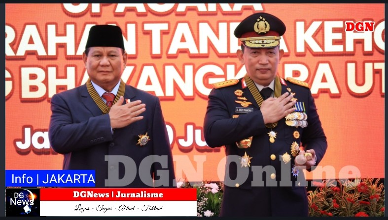 Jakarta – DGNews | Menteri Pertahanan RI sekaligus presiden terpilih Prabowo Subianto menerima tanda kehormatan Bintang Bhayangkara Utama dari Polri. Penyematan tanda kehormatan itu dilaksanakan di Rupattama Markas Besar (Mabes) Polri, Jakarta Selatan, pada Kamis (20/6/2024) siang.