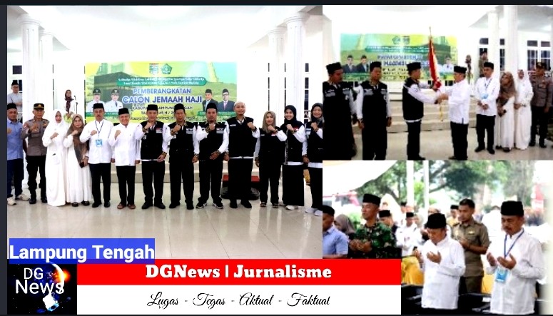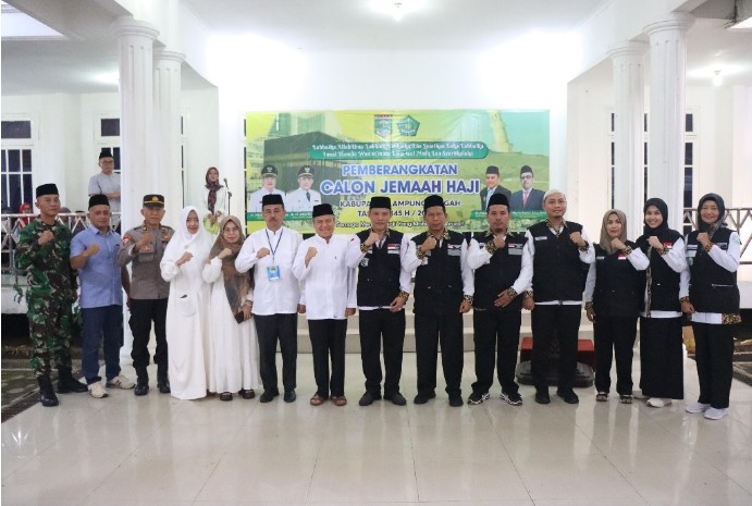 Lampung Tengah | Pelepasan Jamaah haji kloter 23 dan 26 dari Lampung Tengah berlangsung di halaman rumah dinas wakil bupati  Lampung Tengah. Musa Ahmad yang dalam hal ini di Wakili oleh Pj. Sekda Kusuma Riyadi melepas Calon Jamaah Haji Kloter 23 dan 26 Asal Kabupaten Lampung Tengah pada hari Selasa – Rabu 21 – 22 Mei 2024. Dalam kesempatan tersebut hadir Kepala Kantor Kemenag Lampung Tengah, Staf Ahli, Kepala Perangkat Daerah dan Para Calon Jamaah Haji kloter 23 yang berjumlah 385 yang terbagi 10 Rombongan. Untuk Kloter 26 ini dengan jumlah 386 calon jamaah haji dan 6 pendamping dengan rincian 180 laki dan 213 perempuan dengan jumlah Lasia 108. Salah satu calon jamaah haji kloter 26 atas nama Kasmin bin Kartono usia 73 tahun asal kecamatan Bumi Nabung tidak bisa melaksanakan haji karena meninggal dunia pada hari senin 20 mei 2024. Jamaah telah hadir di lokasi mulai pukul 03.00 WIB yang diantar langsung keluarga sebelum dilepas menuju asrama Haji Bandar Lampung pukul 05.30 WIB.