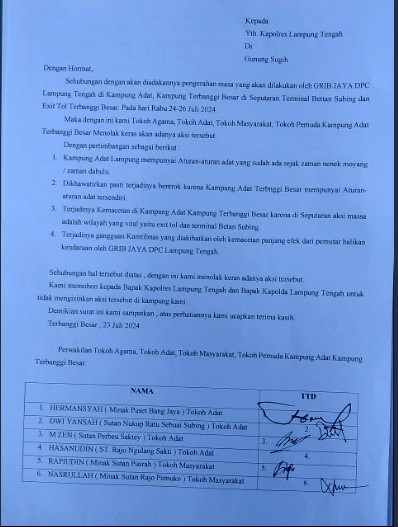 Ketika awak media melakukan konfirmasi ke tokoh adat kampung terbanggi besar mebenarkan adanya pernyataan sikap penolakan rencana aksi demo Ormas GRIB JAYA DPD Lampung yang akan di lakukan di Kampung Adat Terbanggi Besar.