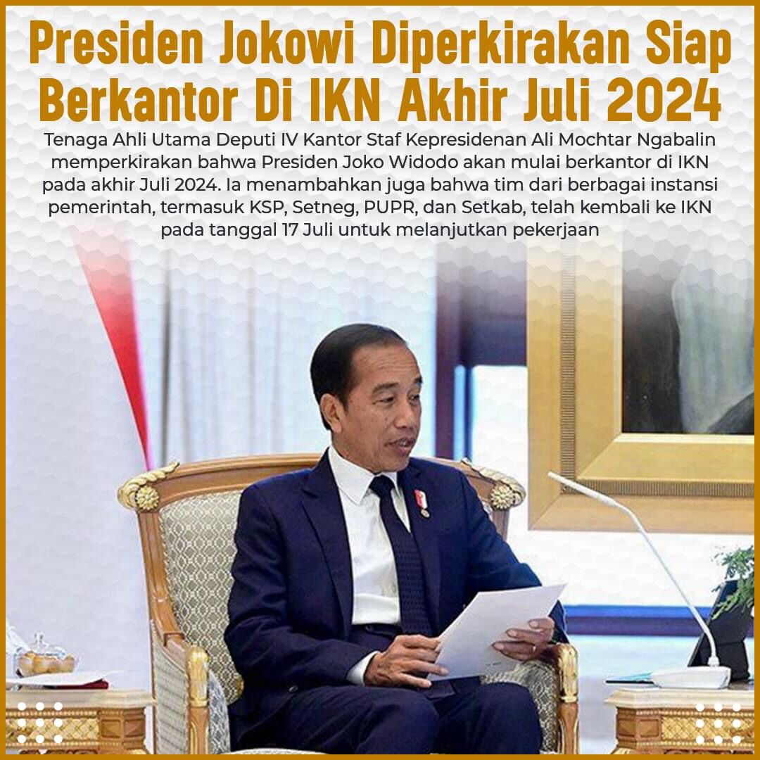 JAKARTA – DGNews |Presiden Joko Widodo diperkirakan akan mulai berkantor di Ibu Kota Nusantara (IKN) pada akhir Juli 2024, meski pembangunan menghadapi kendala cuaca.