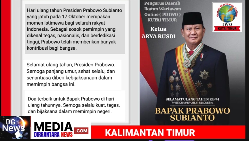Pengurus Daerah Ikatan Wartawan Online (PD IWO) Kabupaten Kutai Timur menjadi salah satu yang mengucapkan selamat ulang tahun kepada Presiden Prabowo Subianto. Ketua PD IWO Kutim, Arya Rusdi, menyampaikan doa dan harapan untuk Presiden dan bangsa Indonesia.