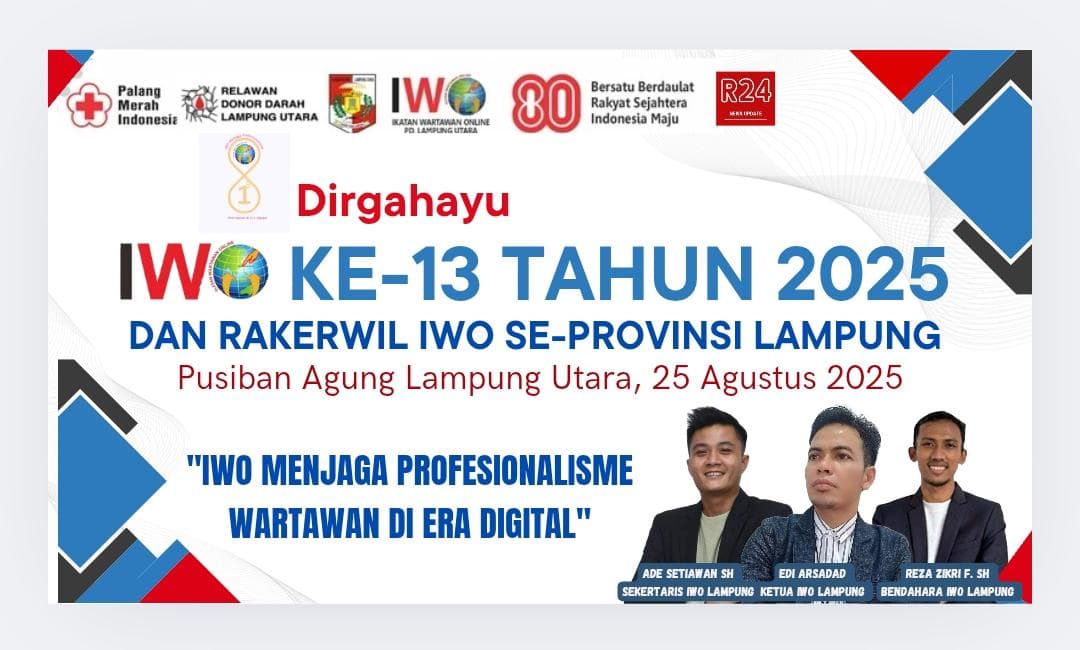 Lampung Utara — Rapat kerja wilayah (RAKERWIL) Ikatan Wartawan Online (IWO) Se_Provinsi Lampung tahun 2025 akan digelar pada Senin (25/8/25) di Pusiban Agung, Jalan Estiko Siomi, Kelurahan Kelapa 7, Kota Bumi Selatan, Lampung Utara. Rencananya RAKERWIL akan dibuka langsung oleh Bupati Lampung Utara, Dr. Ir Hamartoni Ahadis. M.Si yang sekaligus memeriahkan Hari Ulang Tahun (HUT) IWO ke 13.
