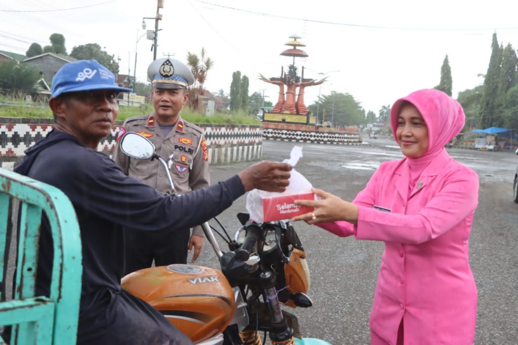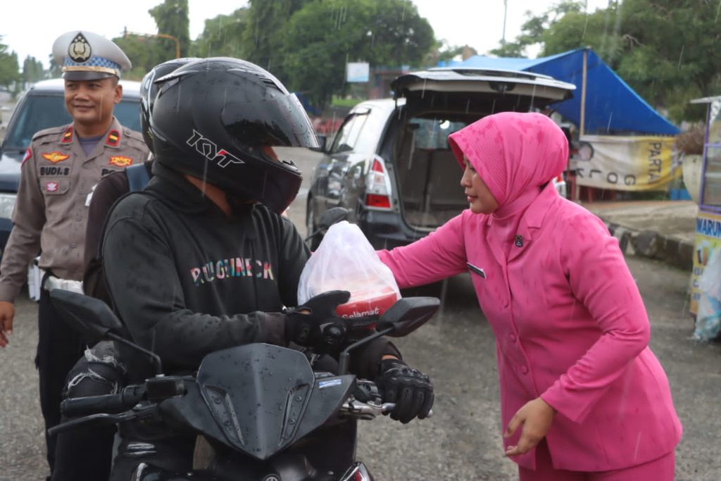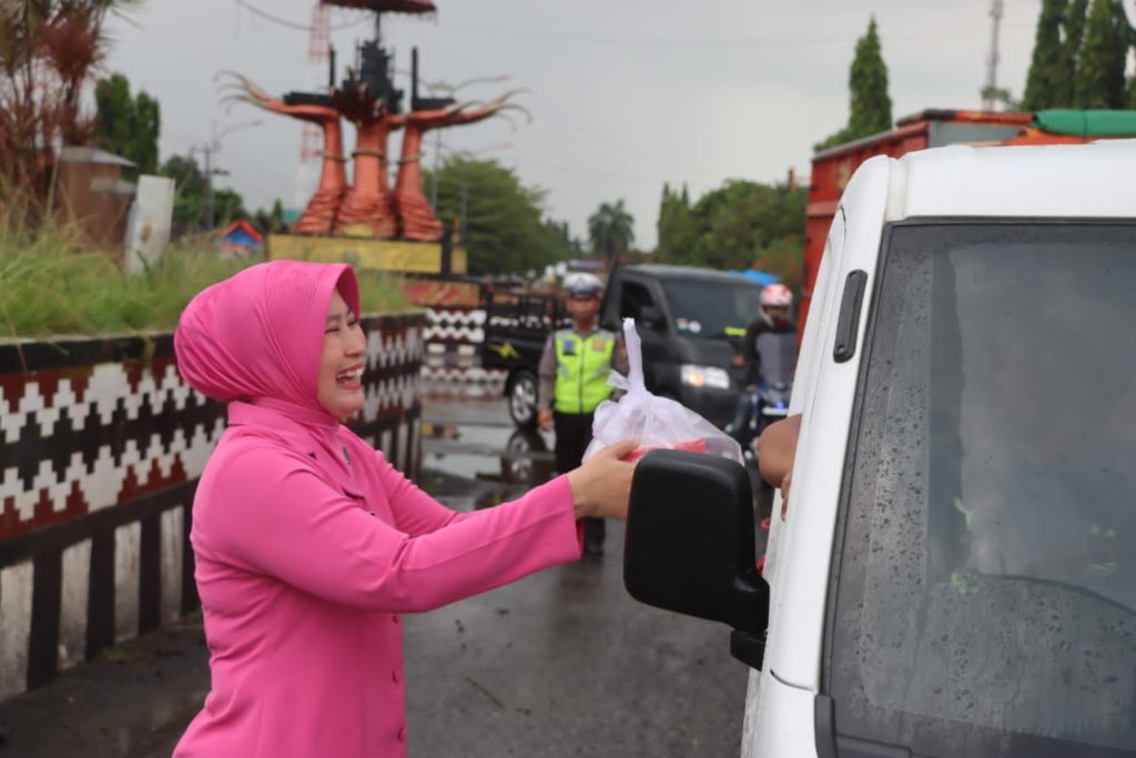 Walau diguyur hujan, terlihat Ibu Ketua Bhayangkari Cabang Lampung Tengah, Ny. Linda Andik pun ikut turun dalam menyapa masyarakat pengguna jalan sekaligus memberikan takjil untuk berbuka puasa.