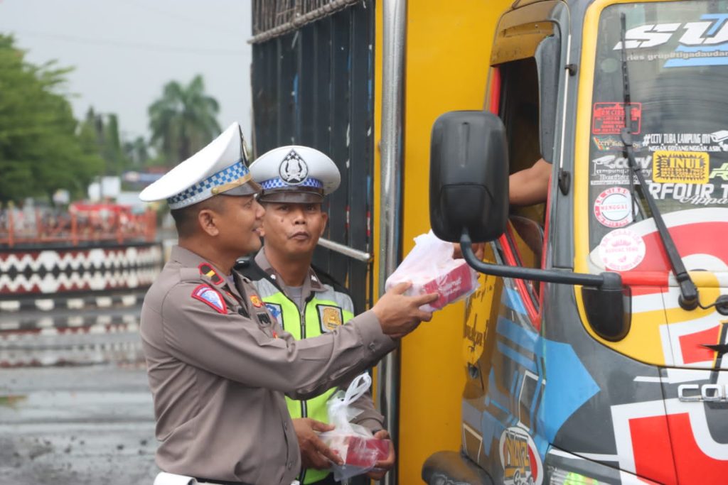 Pemandangan di Jalan Lintas Tengah Sumatera, tepatnya di simpang Tugu Pepadun tampak ramai oleh sejumlah Polisi dari jajaran Polres Lampung Tengah, Polda Lampung yang tengah membagikan takjil untuk masyarakat jelang berbuka puasa. Rabu (27/3/24) sore.