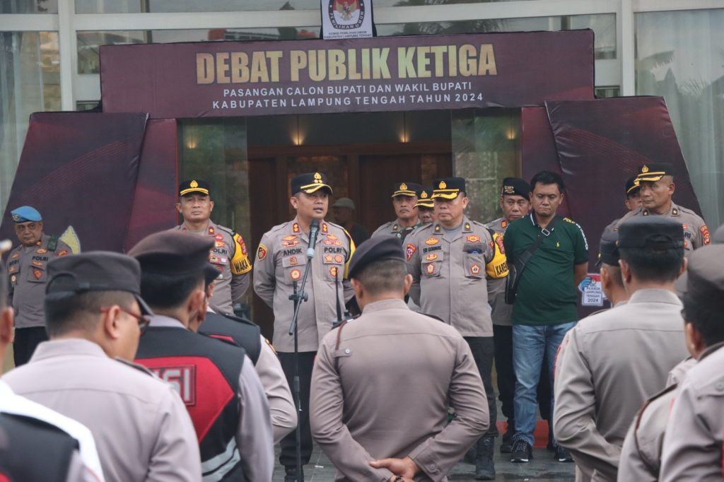 LAMPUNG TENGAH – Ratusan aparat gabungan TNI-Polri di bawah pimpinan Kapolres Lampung Tengah, Polda Lampung, AKBP Andik Purnomo Sigit, S.H., S.I.K, M.M dikerahkan untuk mengamankan jalannya debat ketiga calon kepala daerah Kabupaten Lampung Tengah, Selasa (19/11/24) pukul 14.00 WIB.