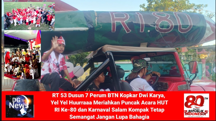 Lempuyang Bandar, Lamteng – Kegiatan HUT ke – 80 Kemerdekaan RI yang serentak diperingati secara nasional bahkan kegiatan demi kegiatan di hampir seluruh wilayah Lampung Tengah mengadakan kegiatan lomba lomba dan Bhakti sosial menjadi perhatian khusus karena semangat antusiasnya yang tinggi. Kini media tertuju pada kegiatan HUT Kemerdekaan di RT 53 dusun 7 perum BTN Kopkar Dwi Karya Kampung lempuyang bandar Kec. Way pengubuan Kab. Lampung tengah Prop. Lampung. Setelah beberapa kegiatan Bhakti sosial, lomba lomba dan karnaval di laksanakan acara puncakpun digelar sangat meriah.