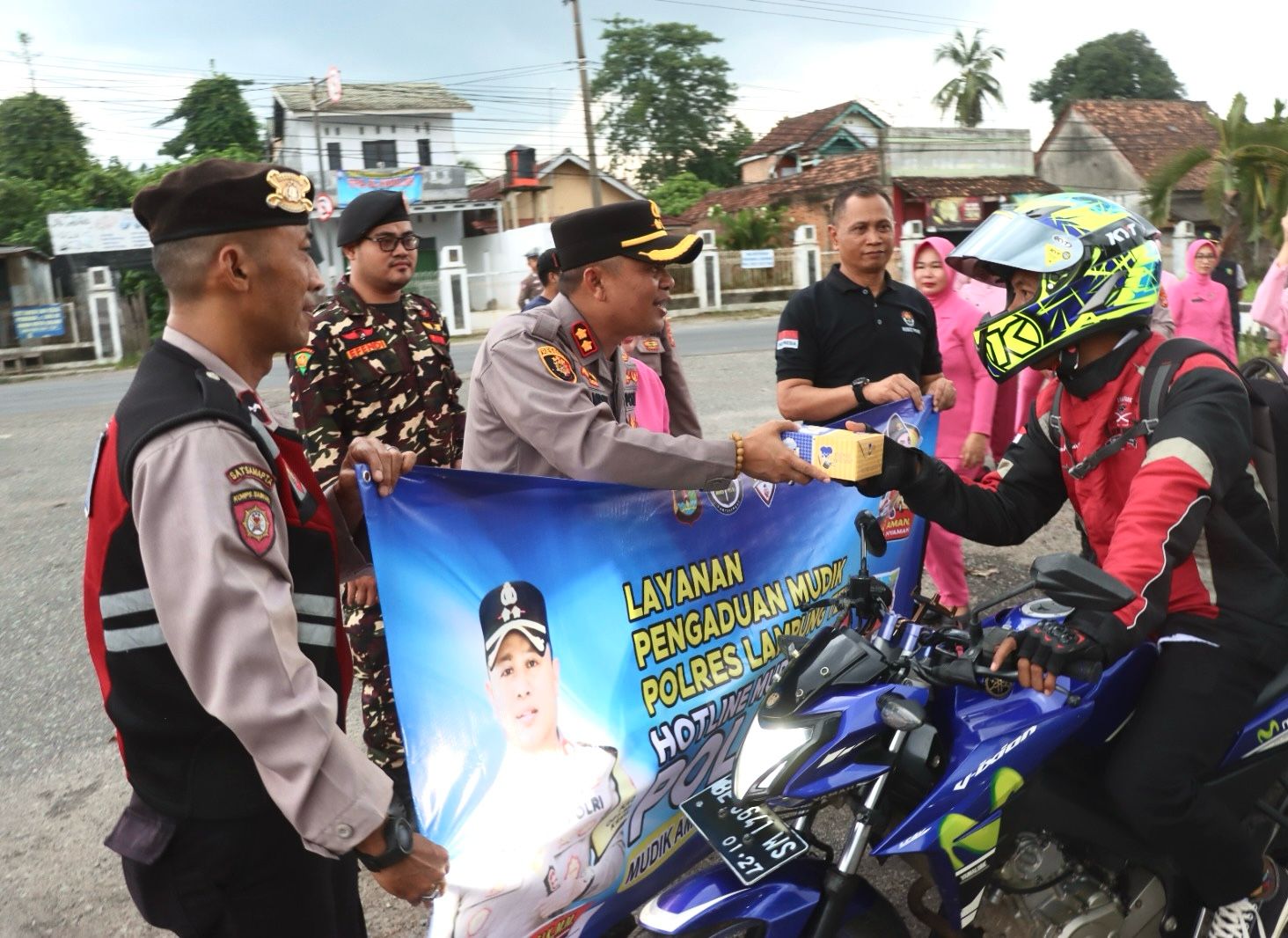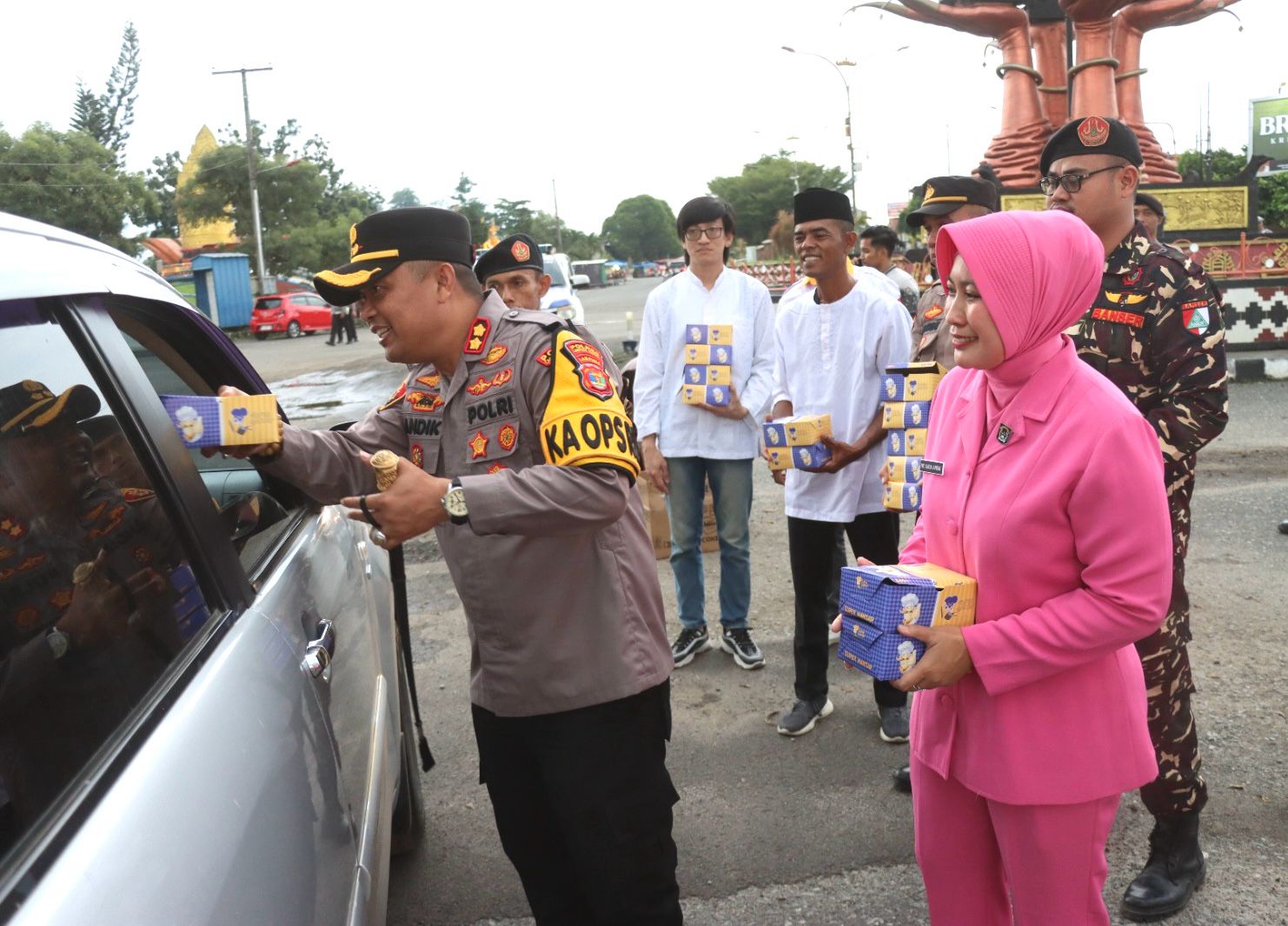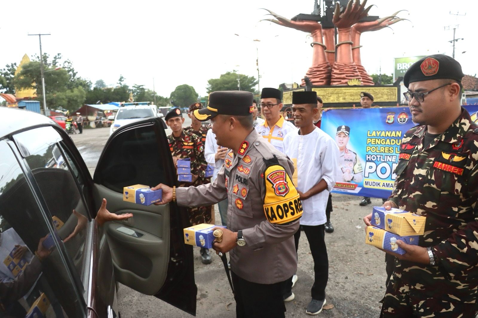 Kegiatan yang berlangsung di simpang Tugu Pepadun, Gunung Sugih menjelang waktu berbuka ini juga dimanfaatkan untuk mensosialisasikan tagline “Mudik Aman, Keluarga Nyaman” serta layanan Kepolisian melalui hotline 110.