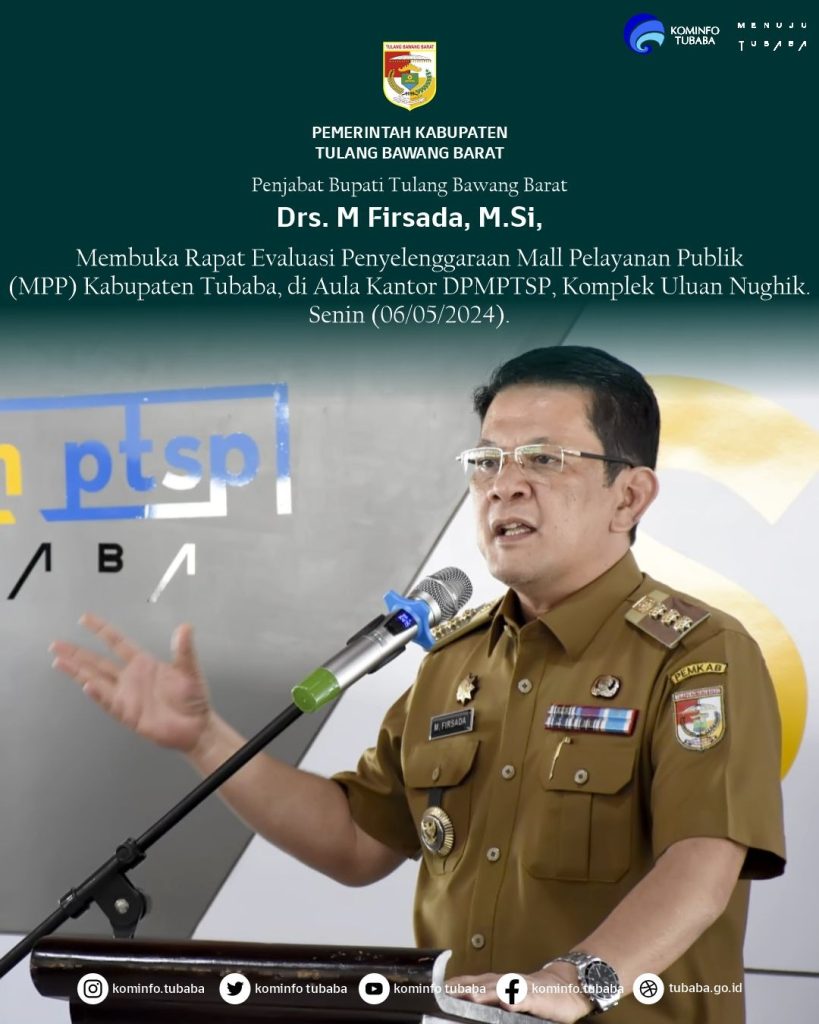 Diskominfo. tubaba.go.id – Penjabat (Pj) Bupati Tulangbawang Barat (Tubaba) Drs. M.Firsada, M.Si, membuka Rapat Evaluasi Penyelenggaraan Mall Pelayanan Publik (MPP) Kabupaten Tubaba, di Aula Kantor Dinas Penanam modal dan Pelayanan Terpadu Satu Pintu (DPMPTSP), Komplek Uluan Nughik. Senin (06/05/2024).