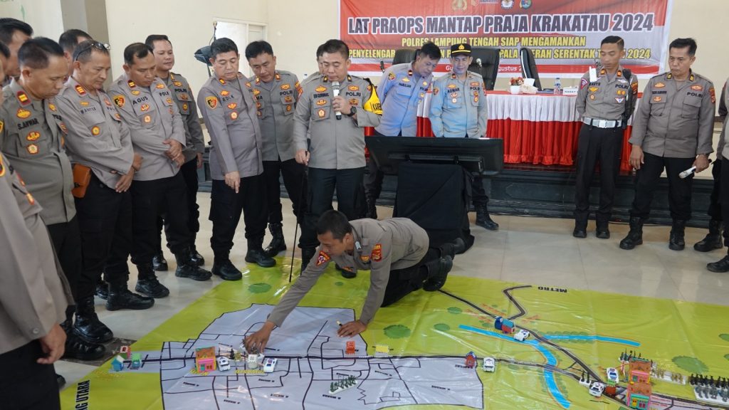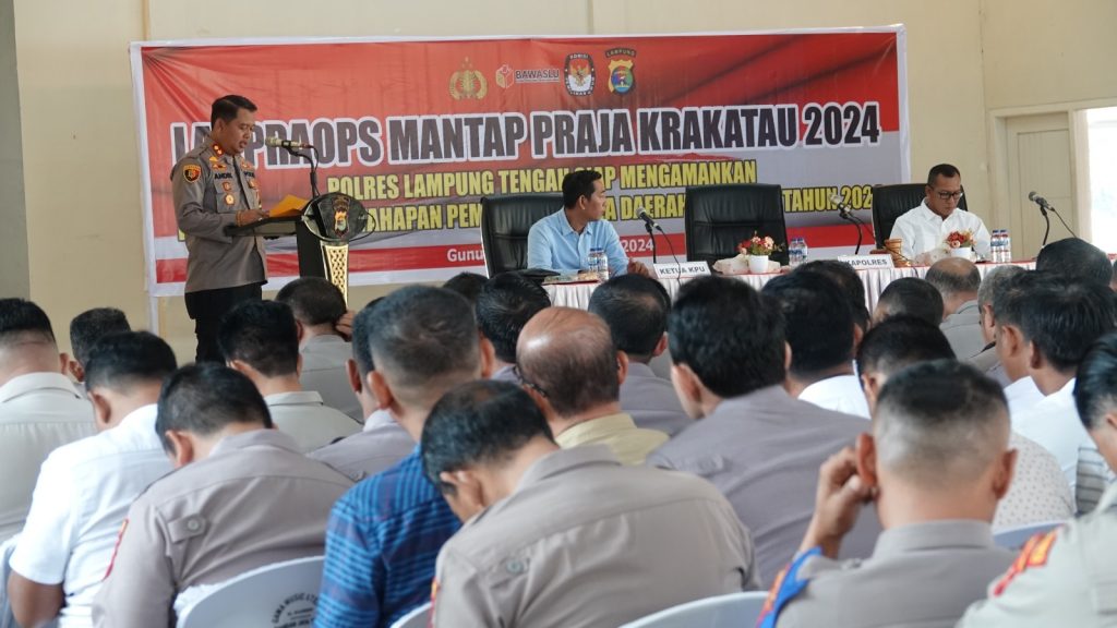 Lampung Tengah | Dengan mengusung tema “Polres Lampung Tengah Siap Mengamankan Penyelenggaraan Tahapan Pilkada Serentak 2024, Kapolres Lampung Tengah, Polda Lampung AKBP Andik Purnomo Sigit, S.H., S.I.K., M.M memimpin langsung pelaksanaan Lat Pra Ops Mantap Praja Krakatau 2024. Kamis (15/8/24) pagi.