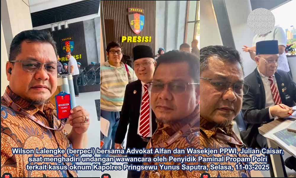 Hal tersebut disampaikan Wilson Lalengke yang dicantumkan dalam berita acara wawancara yang dilakukan oleh penyidik Biro Paminal Divpropam Polri, Selasa, 11 Maret 2025. “Saya meminta agar Kapolres Pringsewu AKBP Yunus Saputra segera diproses dan diberi sanksi hingga dipecat dari institusi Polri,” tegas alumni PPRA-48 Lemhannas RI tahun 2012 ini, yang pada saat pengambilan keterangan oleh penyidik didampingi Penasehat Hukum PPWI, Advokat Alfansari, S.H., M.H., M.M. dan Wasekjen PPWI, Julian Caisar.